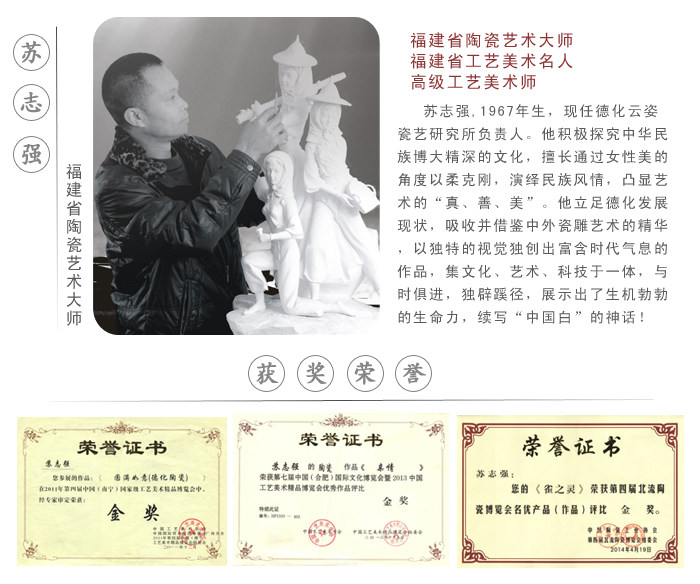 苏志强继往开来,吸收并借鉴中外瓷雕艺术的精华,以独特的视觉独创出富含时代气息的作品,集文化、艺术、科技于一体,展示出了生机勃勃的生命力。