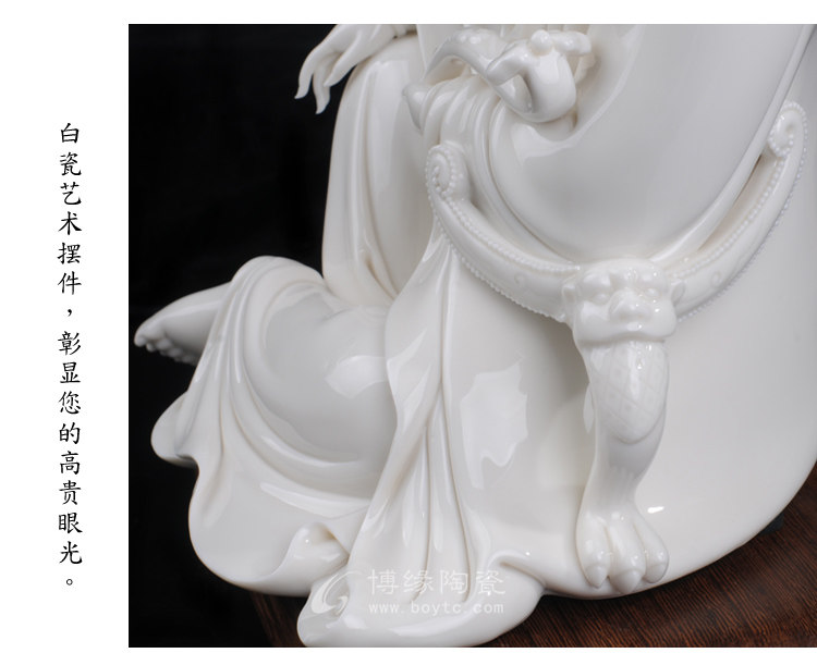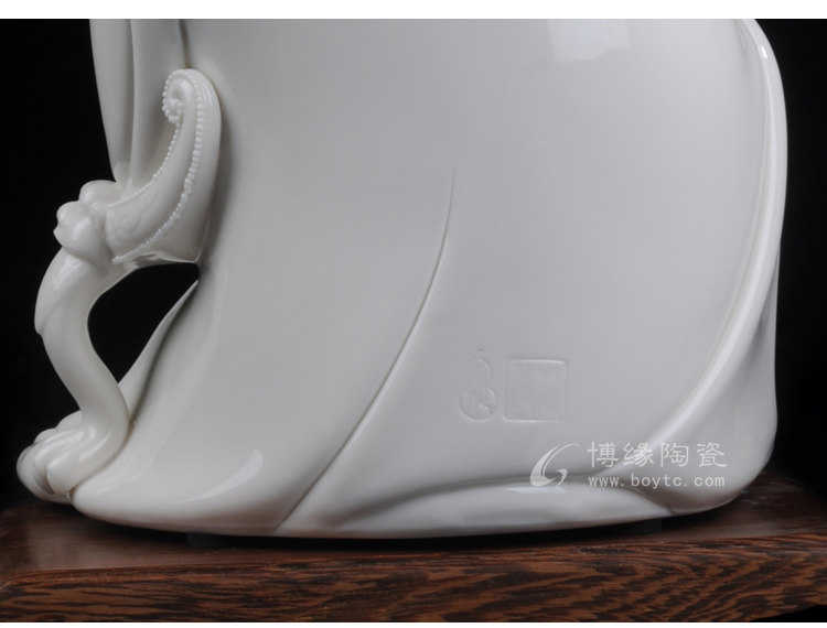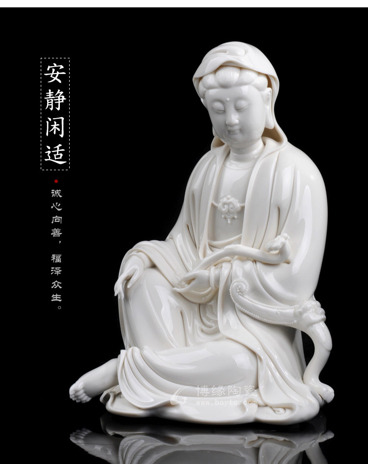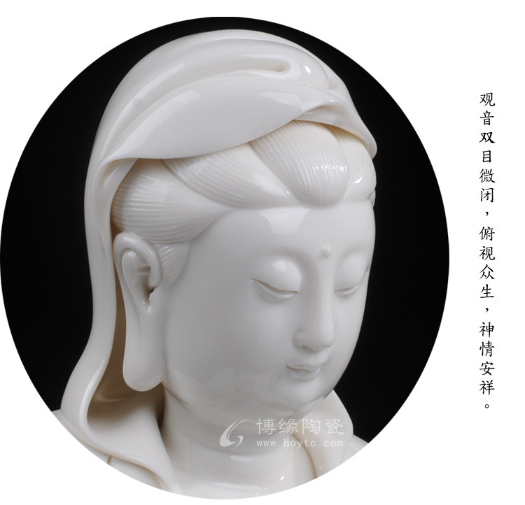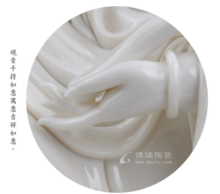 【产品简介】:《如意观音》以德化特有的温润如玉的“中国白”为胎质,纯手工制作,所塑人物性格鲜明,造型优美,神态逼真,风格洗练。